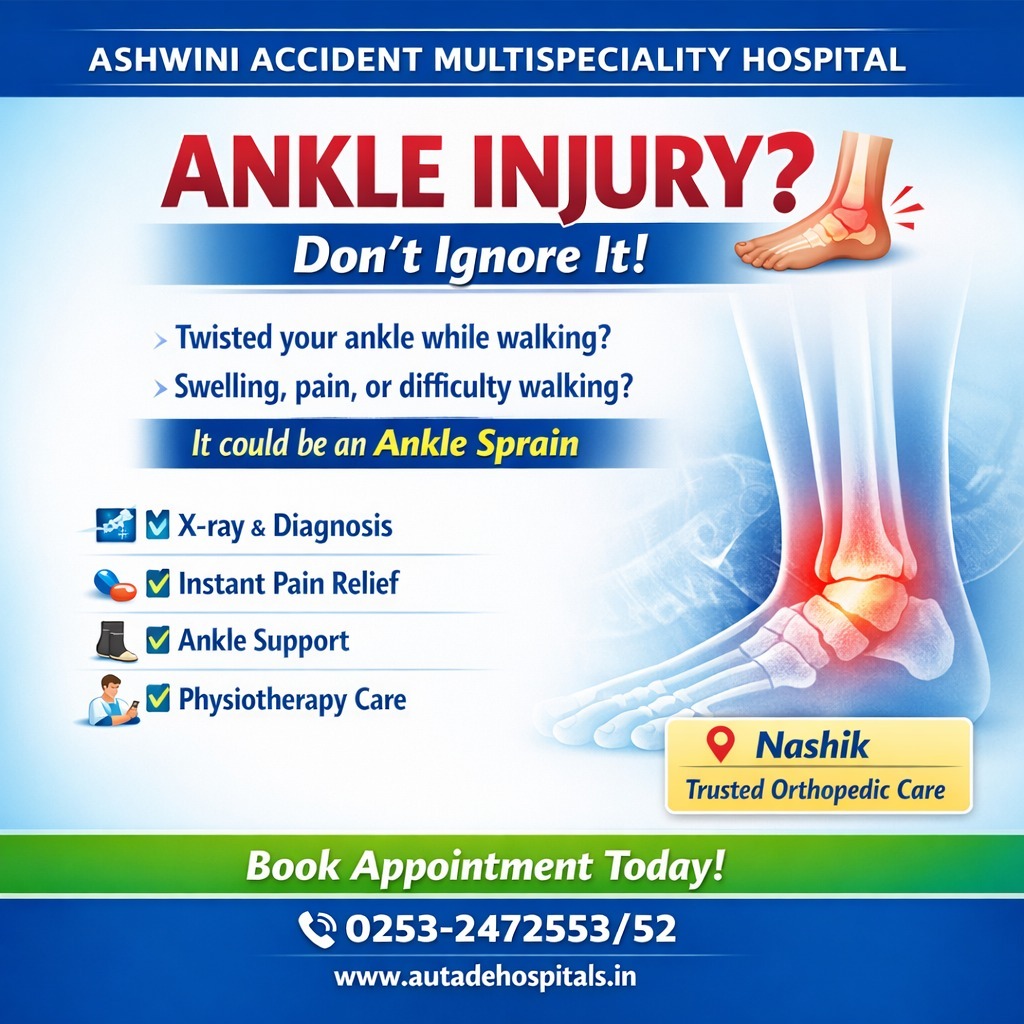 An ankle injury may seem minor at first, but ignoring it can lead to long-term complications. If you’ve twisted your ankle while walking or experienced sudden pain, swelling, or difficulty moving your foot, it could be an ankle sprain that needs proper medical attention. Common Symptoms of Ankle Injury If you are experiencing any of the following, consult an orthopedic specialist immediately: Swelling around the ankle Pain while walking or standing Bruising or tenderness Restricted movement Instability in the ankle What is an Ankle Sprain? An ankle sprain occurs when the ligaments supporting the ankle stretch or tear due to sudden twisting or rolling of the foot. It is one of the most common orthopedic injuries and should not be ignored. Expert Ankle Injury Treatment in Nashik At Ashwini Accident Multispeciality Hospital, Nashik, we provide advanced and reliable orthopedic care for ankle injuries. Our Treatment Services Include: X-ray & accurate diagnosis Immediate pain relief treatment Ankle support & bracing Physiotherapy & rehabilitation Advanced care for severe injuries Consult Experienced Orthopedic Specialist Get treated by Dr. Girish Autade, a trusted Orthopedic & Trauma Specialist with expertise in managing ankle injuries and joint problems. Why Early Treatment is Important? Delaying treatment can lead to: Chronic ankle instability Recurring injuries Long-term pain Difficulty in walking Early diagnosis ensures faster recovery and prevents complications. Best Orthopedic Hospital in Nashik If you’re searching for: Ankle injury treatment in Nashik Best orthopedic doctor for ankle pain Ankle sprain treatment near me Ashwini Accident Multispeciality Hospital is your trusted destination for complete orthopedic care. Book Your Appointment Today Don’t ignore ankle pain—get expert care now. Call: 0253-2472552 / 53 Website: www.autadehospitals.in