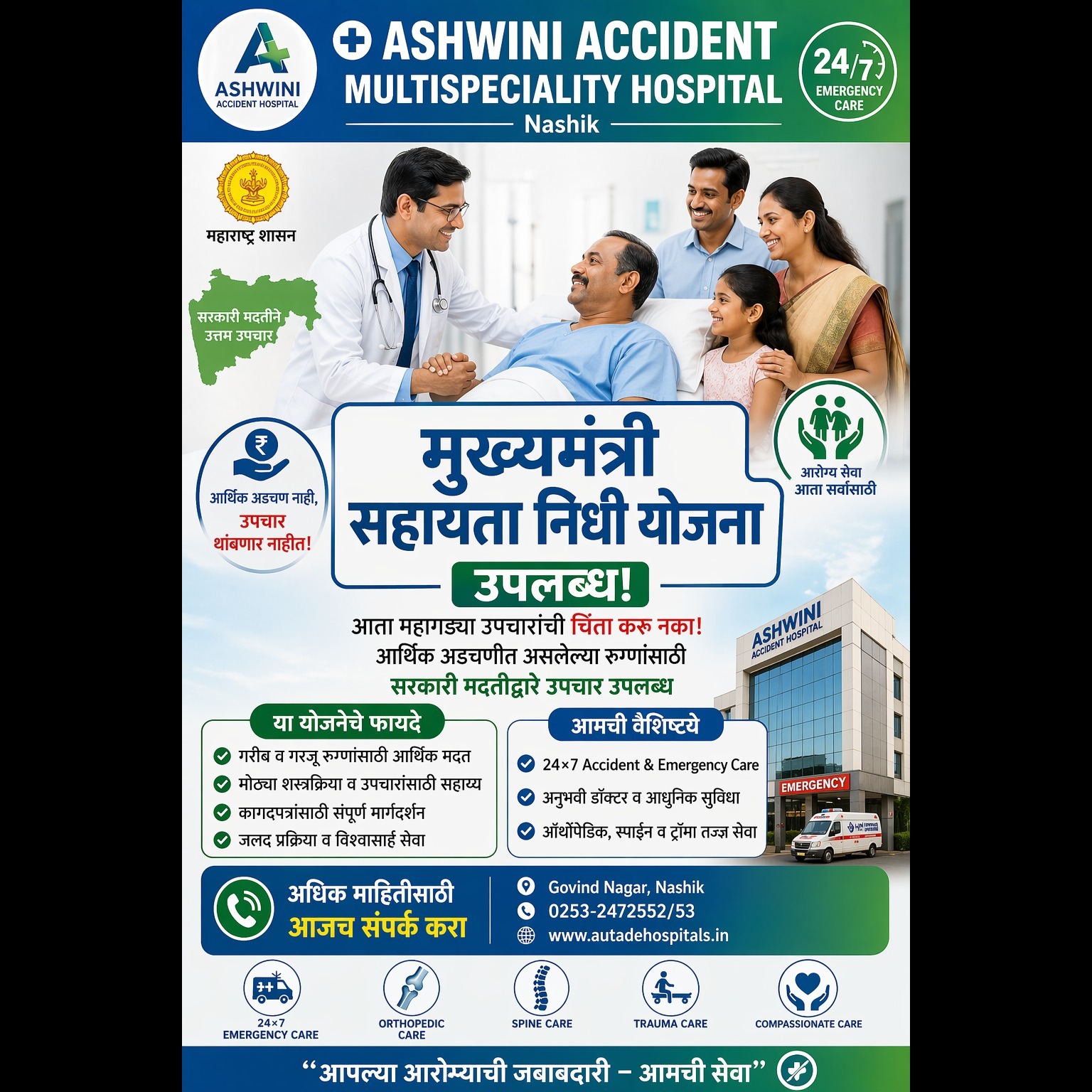 आर्थिक अडचणीमुळे उपचार थांबू नयेत म्हणून महाराष्ट्र शासनाच्या या योजनेअंतर्गत गरजू रुग्णांना आर्थिक मदत मिळते. अपघात, ऑर्थोपेडिक, तसेच इतर गंभीर आजारांच्या उपचारांसाठी पात्र रुग्णांना या योजनेचा लाभ घेता येतो. आमच्या रुग्णालयात या योजनेसाठी आवश्यक कागदपत्रे, अर्ज प्रक्रिया आणि मार्गदर्शन पूर्णपणे दिले जाते, ज्यामुळे रुग्णांना जलद व सोयीस्कर सेवा मिळते. ✔️ आर्थिक मदतीद्वारे उपचार ✔️ तज्ञ डॉक्टरांची सेवा ✔️ 24×7 आपत्कालीन सुविधा ✔️ पारदर्शक व विश्वासार्ह उपचार पद्धती 📍Govind Nagar, Nashik 📞 अधिक माहितीसाठी संपर्क: 0253-2472552/53 आर्थिक अडचण नाही – उपचार थांबणार नाहीत!
