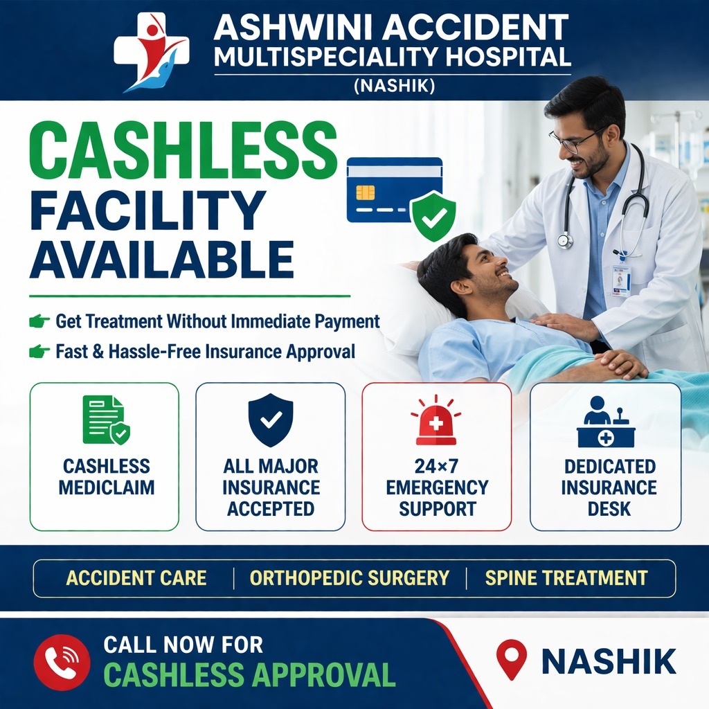 Ashwini Accident Multispeciality Hospital Looking for a cashless hospital in Nashik? Ashwini Accident Multispeciality Hospital offers hassle-free cashless mediclaim services with leading insurance providers. Get quality treatment without worrying about upfront payments. Our Cashless Services: ✔ Cashless Mediclaim Available ✔ Tie-ups with Major Insurance Companies ✔ Dedicated Insurance Assistance Desk ✔ Fast Claim Processing ✔ 24×7 Emergency Care 🚑 Why Choose Us? ✔ Expert Doctors & Medical Team ✔ Advanced Facilities & Equipment ✔ Quick Insurance Approval Support ✔ Trusted Multispeciality Hospital in Nashik Visit Us Today Ashwini Accident Multispeciality Hospital, Nashik Contact us for quick cashless treatment assistance
