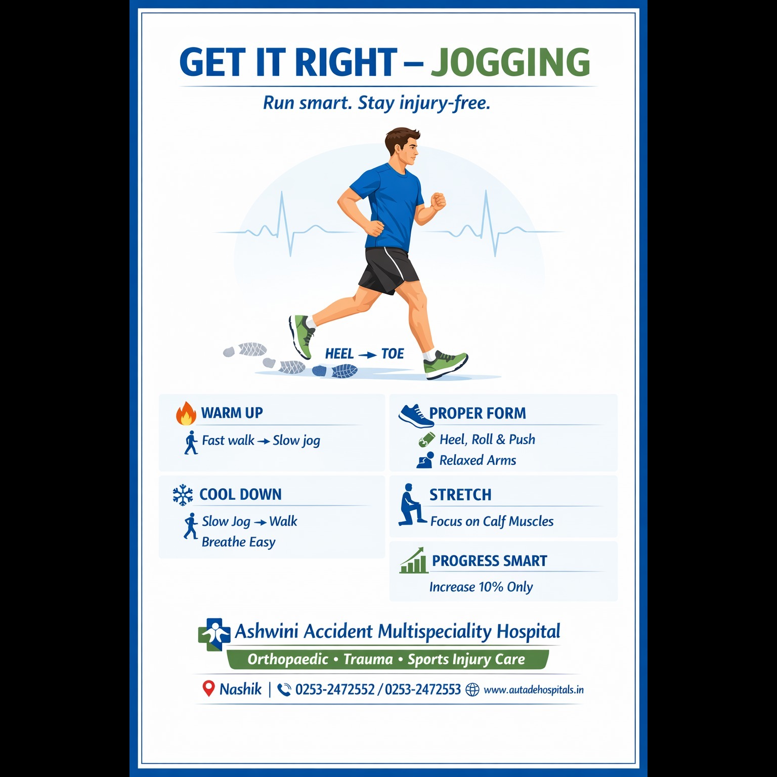 Jogging is a great way to improve heart health, stamina, and overall fitness—but doing it the right way is important to prevent injuries. 1️⃣ Warm up properly Start with a fast walk, then gradually transition into a slow jog. Find a pace that feels comfortable and allows you to breathe easily. 2️⃣ Use correct technique Land on your heels and roll through the foot, pushing off with your toes. Keep your arms relaxed and swing them naturally to maintain balance and momentum. 3️⃣ Cool down gradually At the end of your jogging session, slowly reduce your speed until you return to a walking pace. Continue walking until your heart rate and breathing return to normal. 4️⃣ Stretch while warm Stretch your muscles while they are still warm, giving special attention to your calf muscles to reduce stiffness and prevent injury. 5️⃣ Build gradually Follow a run–walk routine for a total of 10 minutes every 2–3 days. Gradually reduce walking time and increase jogging time. Increase your running duration by no more than 10% at a time to avoid overtraining and injuries. Ashwini Accident Multispeciality Hospital, Nashik Your trusted partner in orthopaedic care, injury prevention, and rehabilitation. Move smart. Stay active. Stay safe.