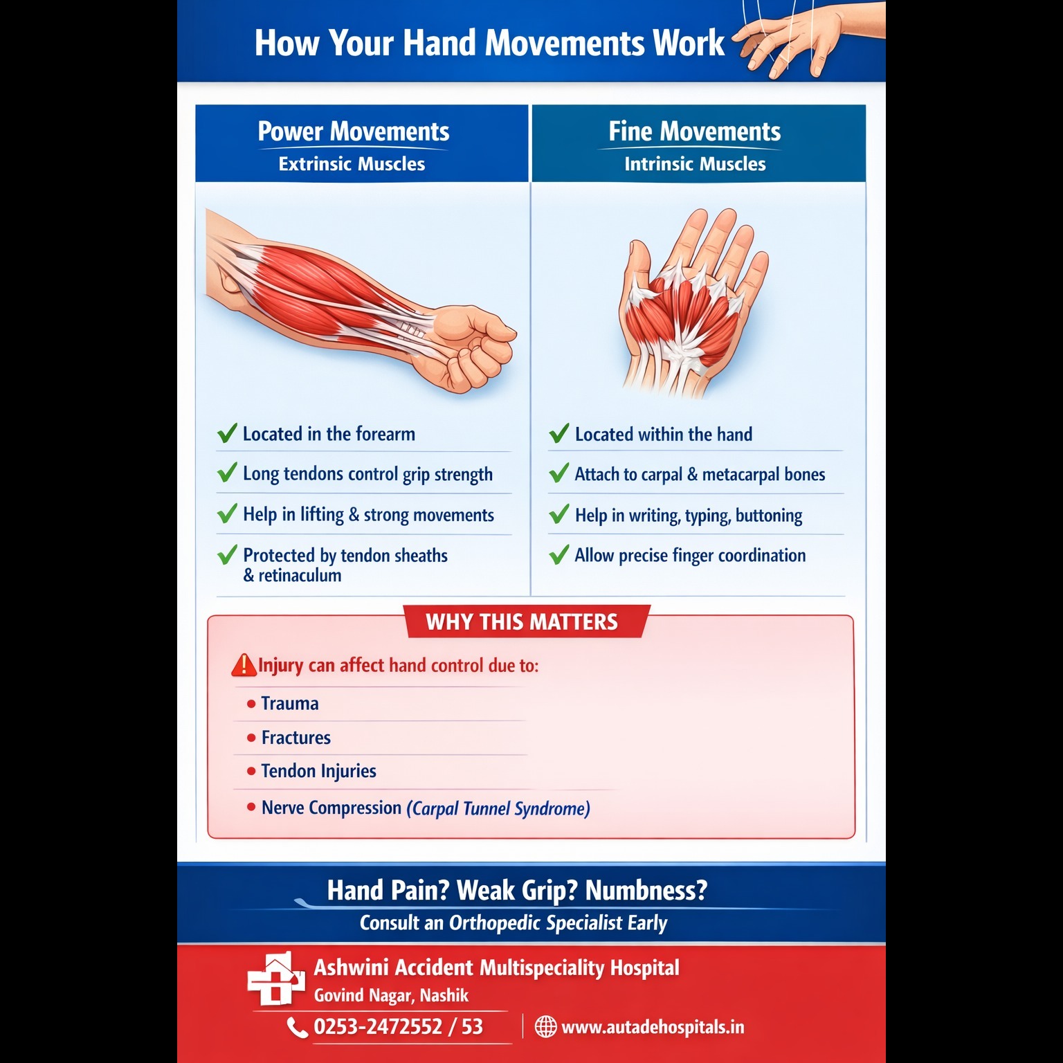 Hand movements are controlled by two main groups of muscles — extrinsic muscles and intrinsic muscles. Both work together to provide strength, precision, and coordination. 1️⃣ Extrinsic Muscles (Power & Force Movements) Crude or forceful hand movements are controlled by muscles that run along the forearm. These are known as the extrinsic muscles of the hand. ✔ Located in the forearm ✔ Connected to hand bones via long tendons ✔ Responsible for gripping, lifting, and strong movements As these tendons pass over the wrist joints, they are surrounded by lubricated tendon sheaths to reduce friction. They are also held in place by strong retaining bands (retinaculum) to prevent displacement during movement. 2️⃣ Intrinsic Muscles (Fine & Precise Movements) Smaller and more delicate hand movements are controlled by intrinsic muscles, which are located within the hand itself. ✔ Attach directly to the carpal and metacarpal bones ✔ Do not extend significantly beyond the knuckles ✔ Control precise finger coordination (writing, buttoning, typing) These muscles connect to the fingers via tendons and allow accurate, controlled movements. Why This Matters? Damage to tendons, nerves, or muscles due to: * Trauma * Fractures * Tendon injuries * Nerve compression (like carpal tunnel syndrome) Can affect hand strength and fine motor control. Early diagnosis and proper orthopaedic care are essential for full recovery. Ashwini Accident Multispeciality Hospital – Nashik is a trusted center for: ✔ Orthopaedic & Trauma Care ✔ Hand & Wrist Injury Treatment ✔ Fracture & Tendon Repair Surgery ✔ Nerve Compression Management ✔ Advanced X-ray & Diagnostic Services ✔ Sports Injury & Joint Care Located in Nashik, Maharashtra Emergency & Trauma Services Available Call: 0253-2472553 / 52 www.autadehospitals.in
