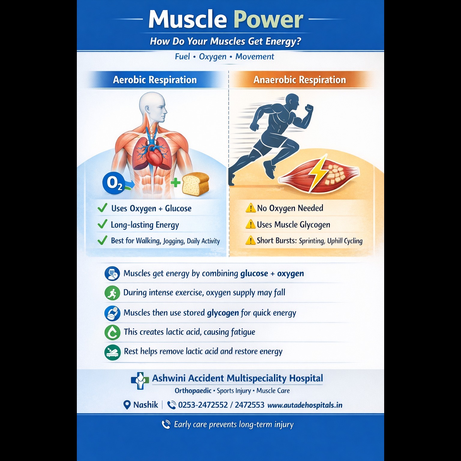 Muscle power Your Muscles get most of energy that powers them by combining glucose with oxygen. This happens in a biochemical process called aerobic (oxygen-based) respiration, which takes place within the muscle cells. The glucose comes from the food you eat and the oxygen from the air you breathe, and your bloodstream delivers these to your muscles and other cells in your body. Energy and exercise When you work your muscles hard, for example when you are exercising, they need a lot more energy than they do when you are resting. Your heart then bets fasted and your lungs work harder to keep them supplied with glucose and oxygen. Sometimes, however, your bloodstream cant supply all the oxygen and glucose that your muscles need, no matter how hard your heart and lungs are working. This can happen during high intensity exercise such as sprinting or uphill cycling. To make up for this shortfall, your muscles get the extra energy they need by drawing on their own reserves of glucose. These reserves take the form of a substance called glycogen, which your muscles and liver. Your muscles can rapidly change this glycogen back into glucose, then produce energy from it process called anaerobic (oxygen free)respiration. Anaerobic respiration provides your muscles with a valuable energy boost, but it doesn’t last very long. Fatigue soon sets in when the glycogen runs out and lactic acid a by product of anaerobic respiration builds up in your muscles need and remove the lactic acid from them. #MusclePower #AerobicRespiration #AnaerobicRespiration #MuscleEnergy #ExerciseScience #SportsInjuryCare #OrthopaedicHospital #AshwiniHospital #HealthyMuscles #NashikDoctors