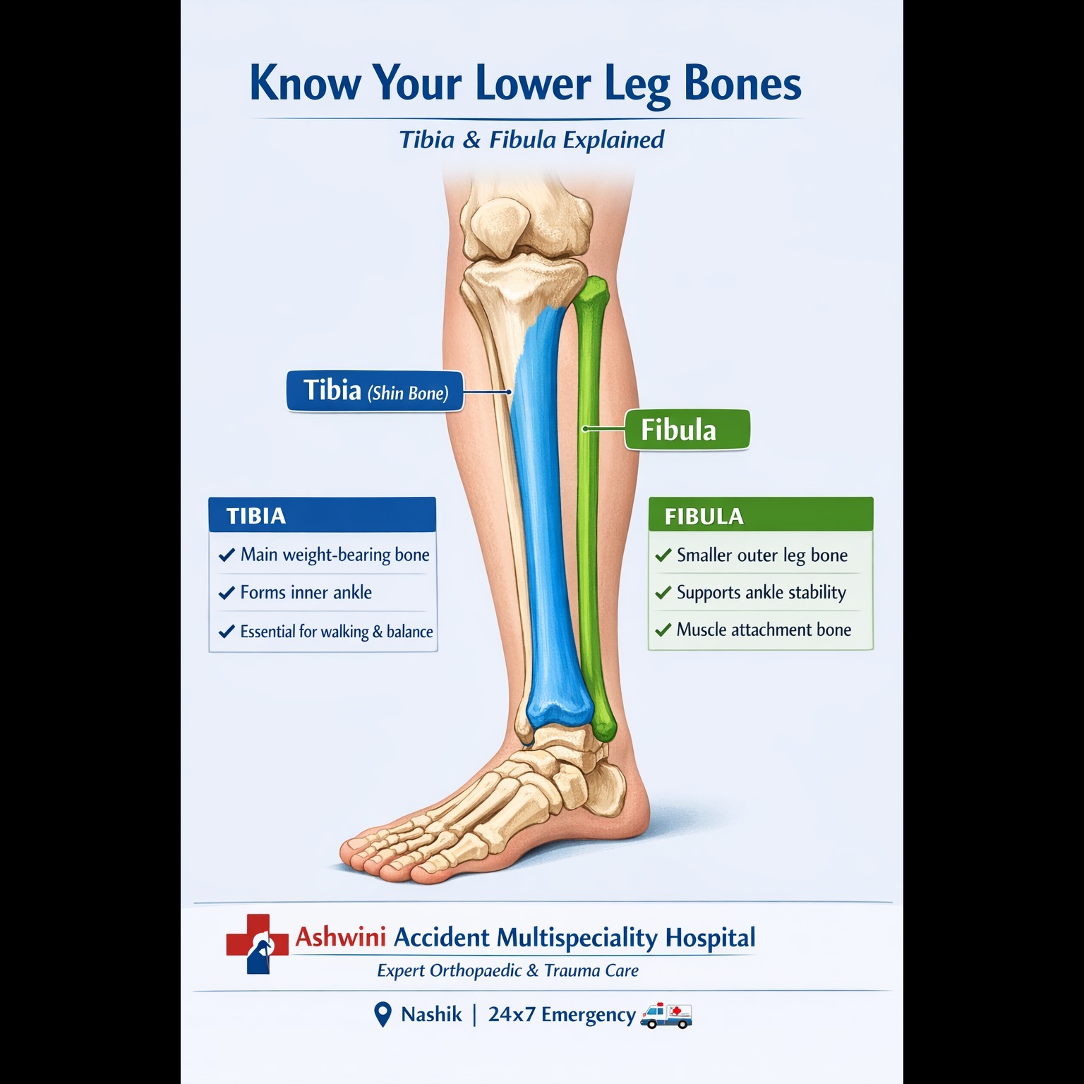 The tibia, commonly known as the shin bone, is the strongest bone in the lower leg and carries most of the body’s weight. It forms the inner part of the ankle and is essential for standing, walking, and balance. The fibula runs along the outer side of the leg. Although it bears less weight, it supports muscles and helps stabilize the ankle joint. #BoneHealth #LegFracture #OrthopaedicCare #TraumaCare #AshwiniHospital #Nashik Fractures or injuries to these bones need prompt orthopaedic evaluation. 🏥 Ashwini Accident Multispeciality Hospital, Nashik Specialized care for accident injuries and lower leg fractures.