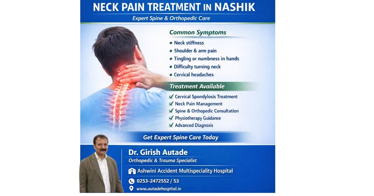 Are you suffering from neck pain, cervical spondylosis, stiffness in the neck, or pain radiating to the shoulder and arms? Do not ignore these symptoms. Early diagnosis and treatment can prevent serious spine problems. At Ashwini Accident Multispeciality Hospital, Nashik, advanced diagnosis and treatment for neck pain and cervical spine problems are available under the expert guidance of Dr. Girish Autade, Orthopedic & Trauma Specialist. Common causes of neck pain include prolonged mobile use, computer work, poor posture, cervical spondylosis, muscle strain, sports injuries, and accidents. Symptoms of Neck Problems * Persistent neck pain * Neck stiffness and difficulty turning the head * Shoulder and arm pain * Numbness or tingling in the hands * Headaches caused by cervical problems Treatments Available ✔ Cervical Spondylosis Treatment ✔ Neck Pain Management ✔ Spine Care & Orthopedic Consultation ✔ Physiotherapy & Rehabilitation Guidance ✔ Advanced Diagnostic Evaluation If you are looking for a spine specialist, orthopedic doctor, or neck pain treatment in Nashik, visit Ashwini Accident Multispeciality Hospital for expert care. Dr. Girish Autade Orthopedic & Trauma Specialist Ashwini Accident Multispeciality Hospital Advanced Orthopedic & Spine Care Center in Nashik Appointment: 0253-2472552 / 53 Website: www.autadehospital.in Nashik, Maharashtra