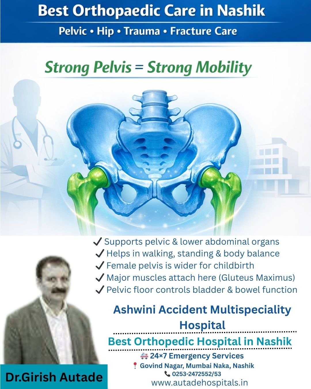 Ashwini Accident Multispeciality Hospital is a trusted name for orthopaedic and trauma care in Nashik, specializing in the diagnosis and treatment of pelvic fractures, hip injuries, and musculoskeletal disorders. The pelvic girdle is a strong, basin-shaped structure that supports the lower abdominal and pelvic organs. It plays a vital role in weight bearing, balance, walking, and locomotion. The female pelvis is naturally wider and deeper, allowing childbirth, while also supporting major muscles like the gluteus maximus, essential for hip and leg movement. The pelvic floor muscles support the bladder, rectum, and pelvic organs and help control urinary and bowel function. Injuries or weakness in this region require expert orthopaedic evaluation and timely treatment. Recognized as one of the best orthopaedic hospitals in Nashik, we provide advanced care for: Pelvic fracture treatment in Nashik Hip injury and hip fracture care Accident & trauma cases Sports injuries and rehabilitation Our hospital offers 24×7 emergency orthopaedic services, modern diagnostic facilities, experienced orthopaedic surgeons, and comprehensive physiotherapy support. Ashwini Accident Multispeciality Hospital Govind Nagar, Mumbai Naka, Nashik – 422009, Maharashtra Emergency Contact: 0253-2472552 / 8888871151