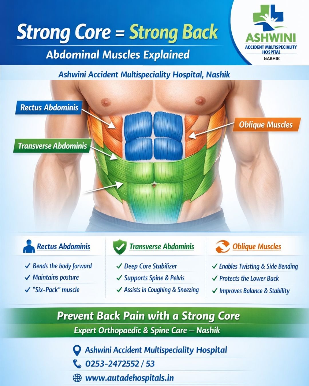 Abdominal Muscles & Core Strength – Orthopaedic Care in Nashik Your abdominal muscles play a crucial role in supporting your trunk and lower back, maintaining posture, and protecting your spine. Strong core muscles help regulate internal abdominal pressure, which is essential for breathing, coughing, sneezing, and safe lifting. Proper core strength is important in the prevention and treatment of back pain. Rectus Abdominis The rectus abdominis is the main muscle at the front of the abdomen and allows you to flex your torso. It is divided into sections by connective tissue, giving a fit abdomen its well-known six-pack appearance. Weakness in this muscle can contribute to lower back pain and posture issues. Transverse Abdominis Located beneath the rectus abdominis, the transverse abdominis is a deep stabilizing muscle that acts like a natural support belt for the spine. It is vital for spine stability, core rehabilitation, and back pain treatment in Nashik, especially after injury or surgery. Abdominal Oblique Muscles The abdominal oblique muscles run along the sides of the abdomen and allow twisting, rotation, and side bending movements. They also provide strong support to the lower back, helping reduce muscle strain and spinal stress during daily activities. Strong abdominal and core muscles are essential for preventing back pain, spine injuries, and muscle imbalance. At Ashwini Accident Multispeciality Hospital, Nashik, we provide expert orthopaedic consultation, spine care, physiotherapy guidance, and core muscle rehabilitation for patients of all age groups. Trusted Orthopaedic & Spine Care Hospital in Nashik Back Pain • Core Muscle Weakness • Spine Rehabilitation #CoreStrength #AbdominalMuscles #BackPainCare #SpineCareNashik #OrthopaedicHospitalNashik #AshwiniAccidentHospital