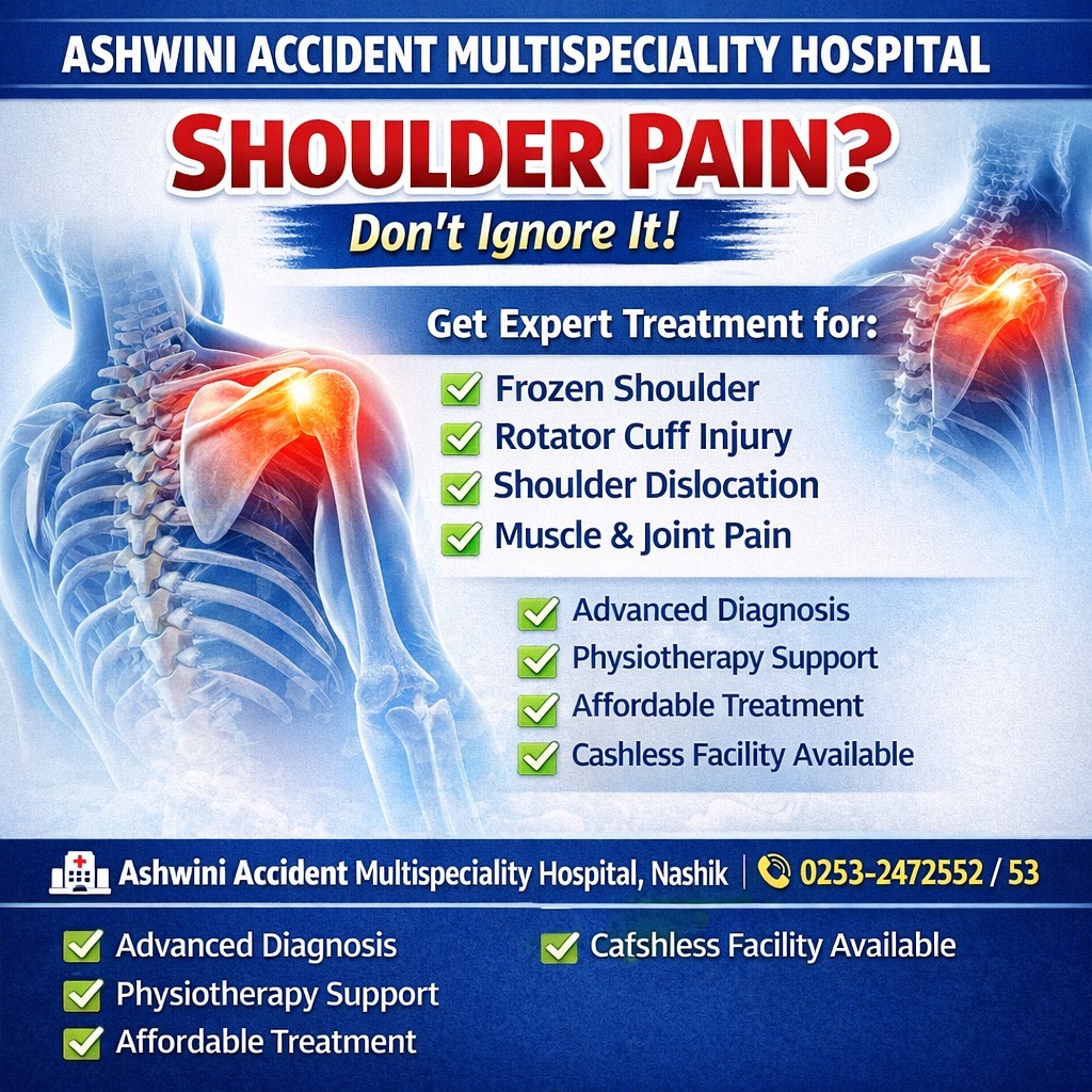 Are you suffering from shoulder pain in Nashik? Don’t ignore early symptoms — what starts as mild discomfort can turn into serious conditions like frozen shoulder, rotator cuff injury, or shoulder joint damage. At Ashwini Accident Multispeciality Hospital, Nashik, we provide advanced shoulder pain treatment with expert care from Dr. Girish Autade (Orthopedic & Trauma Specialist). 🔍 Common Shoulder Problems We Treat: ✔ Frozen Shoulder Treatment in Nashik ✔ Rotator Cuff Injury Treatment ✔ Shoulder Dislocation Management ✔ Muscle & Joint Pain Relief ✔ Sports Injury & Ligament Care ⚠️ Symptoms You Should Not Ignore: * Shoulder pain lasting more than a few days * Difficulty lifting your arm * Stiffness or restricted movement * Pain while sleeping on one side Why Choose Us? ✅ Experienced Orthopedic Specialist in Nashik ✅ Advanced Diagnostic & Treatment Facilities ✅ Cashless Treatment Available ✅ Personalized Patient Care Best Shoulder Pain Hospital in Nashik Ashwini Accident Multispeciality Hospital Call Now: 0253-2472552 / 53 Visit: www.autadehospital.in
